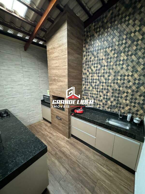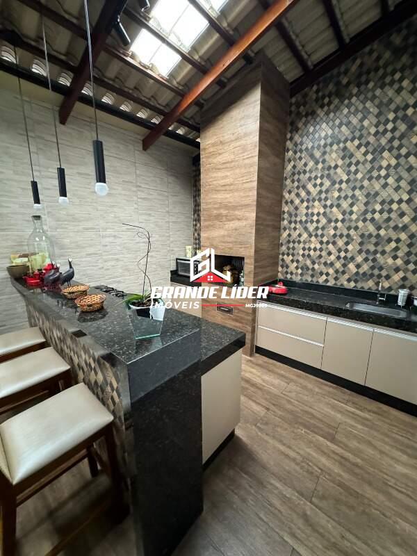Cozinha com armários planejados e bancas em granito conjugada com a área Gourmet com churrasqueira